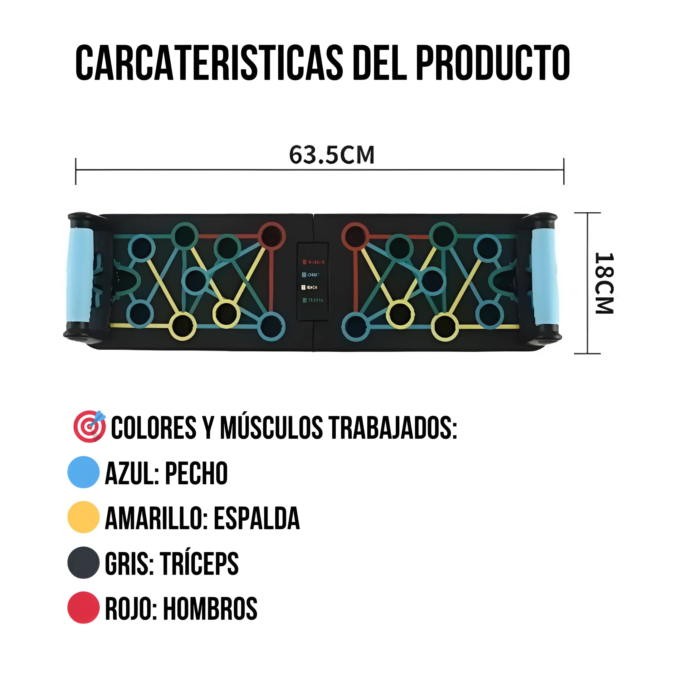La tabla de flexiones 10 en 1 es el accesorio ideal para mejorar tu entrenamiento en casa, en la oficina o donde quieras. Su diseño innovador permite trabajar de forma específica distintos grupos musculares gracias a su sistema de colores: